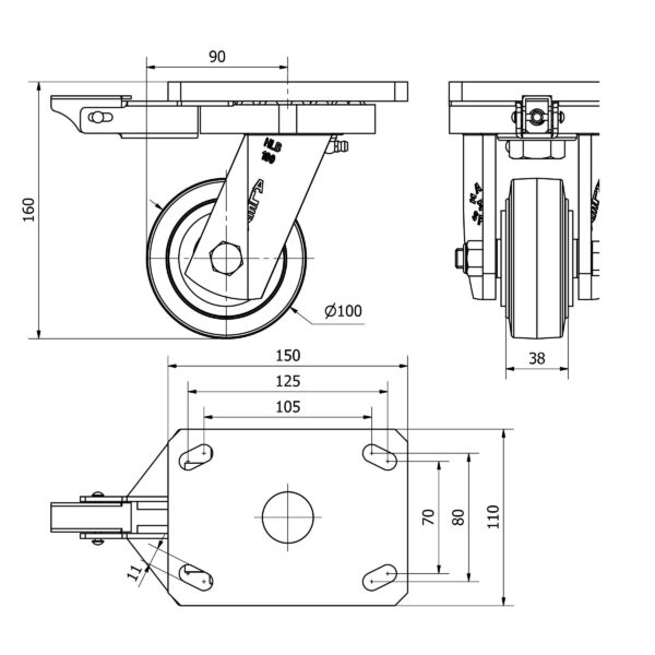 Rueda goma giratoria con bloqueo direccional Alex diametro 100 mm. modelo 2-3354