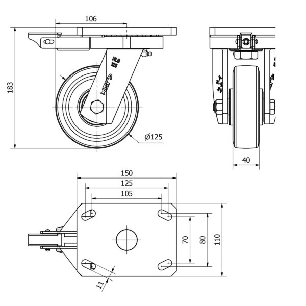 Rueda goma giratoria con bloqueo direccional Alex diametro 125 mm. modelo 2-3349