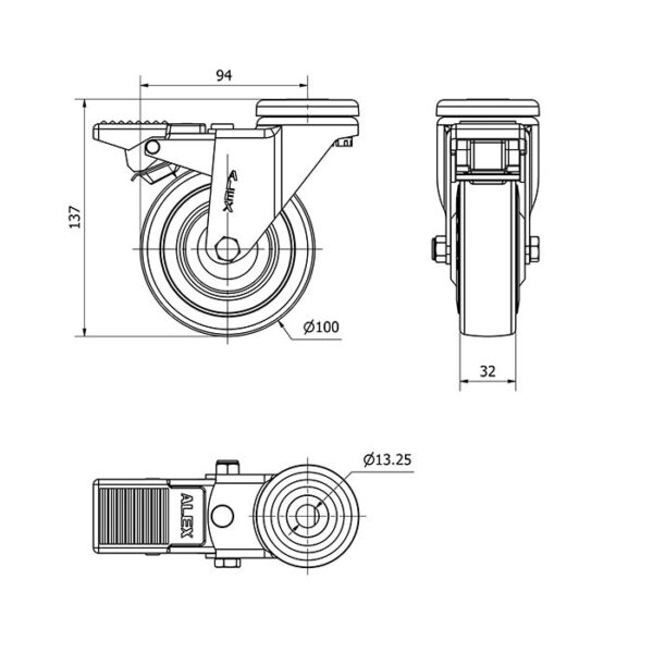 Rueda goma giratoria con freno Alex diametro 100 mm. modelo 2-1210