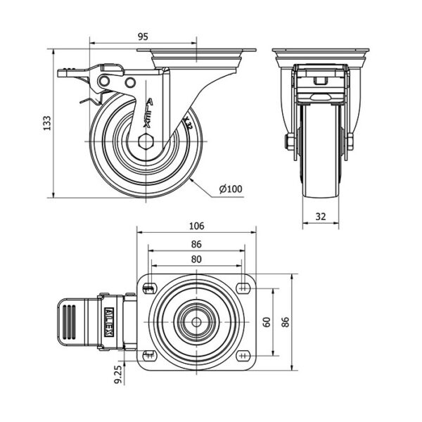 Rueda goma giratoria con freno Alex diametro 100 mm. modelo 2-1662