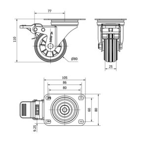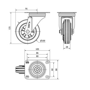 Rueda goma giratoria con freno Alex diametro 100 mm. modelo 2-1682