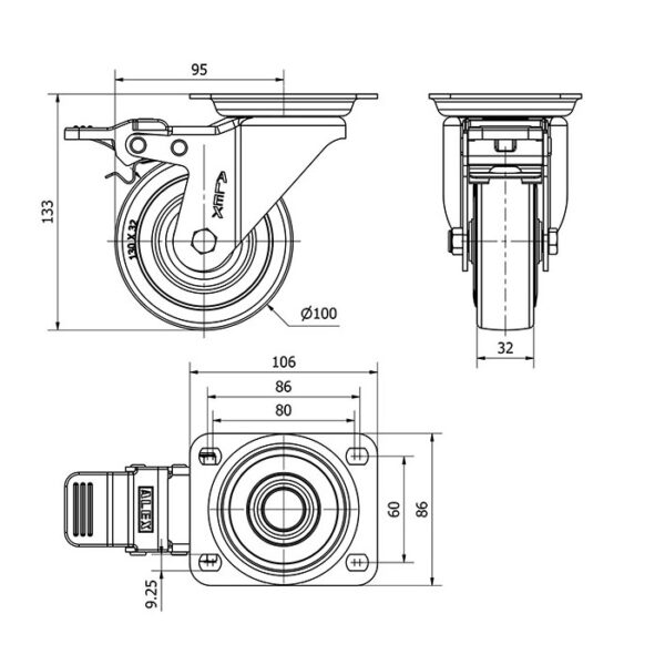 Rueda goma giratoria con freno Alex diametro 100 mm. modelo 2-2398