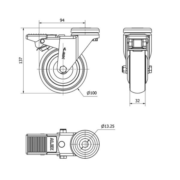 Rueda goma giratoria con freno Alex diametro 100 mm. modelo 2-2716