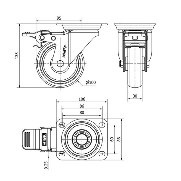 Rueda goma giratoria con freno Alex diametro 100 mm. modelo 2-3235