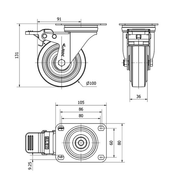 Rueda goma giratoria con freno Alex diametro 100 mm. modelo 2-3760
