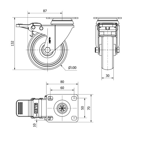 Rueda goma giratoria con freno Alex diametro 100 mm. modelo 2-4610