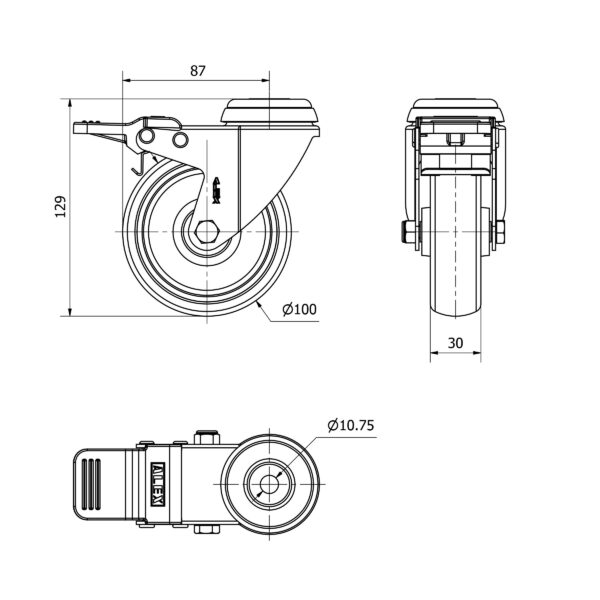 Rueda goma giratoria con freno Alex diametro 100 mm. modelo 2-4620