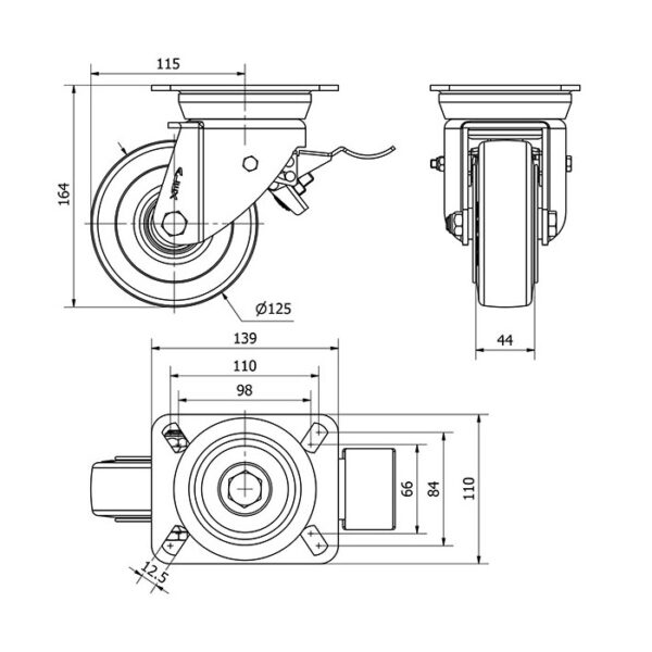 Rueda goma giratoria con freno Alex diametro 125 mm. modelo 2-1611