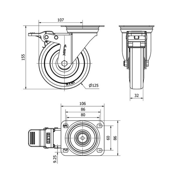 Rueda goma giratoria con freno Alex diametro 125 mm. modelo 2-1663