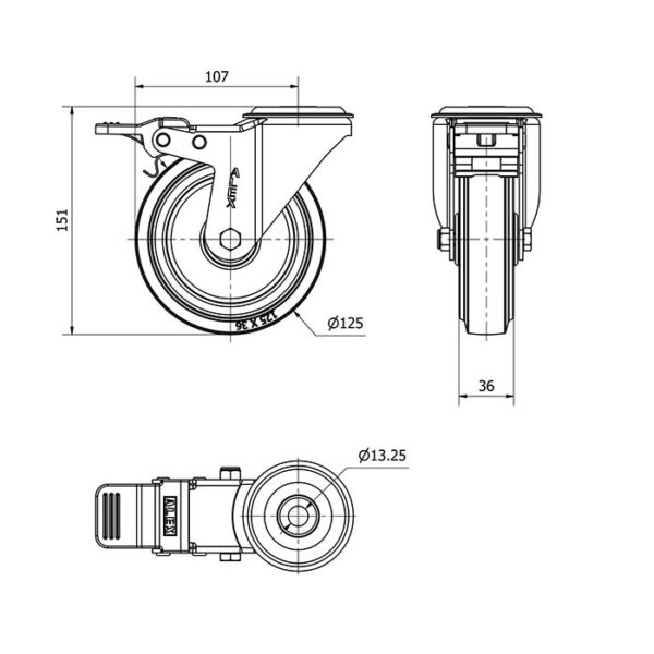 Rueda goma giratoria con freno Alex diametro 125 mm. modelo 2-2752