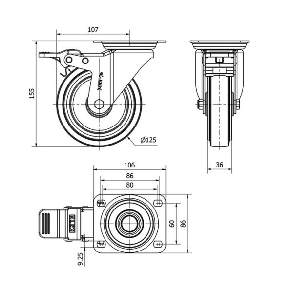 Rueda goma giratoria con freno Alex diametro 125 mm. modelo 2-3768
