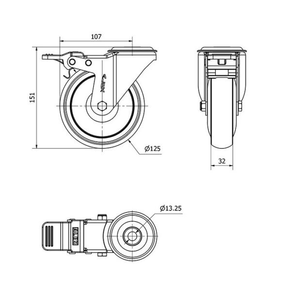 Rueda goma giratoria con freno Alex diametro 125 mm. modelo 2-4793