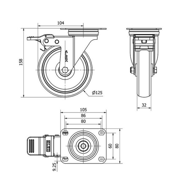 Rueda goma giratoria con freno Alex diametro 125 mm. modelo 2-4870