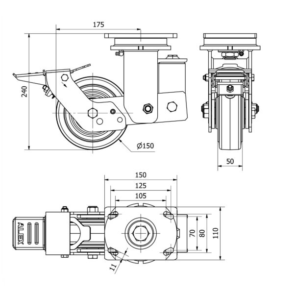 Rueda goma giratoria con freno Alex diametro 150 mm. modelo 2-3934