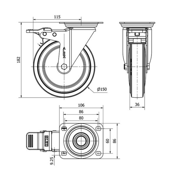 Rueda goma giratoria con freno Alex diametro 150 mm. modelo 2-4262