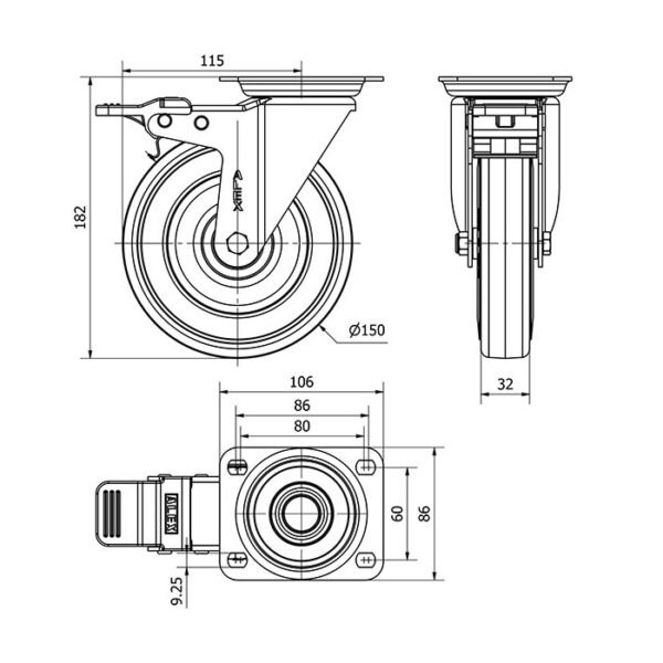 Rueda goma giratoria con freno Alex diametro 150 mm. modelo 2-4354