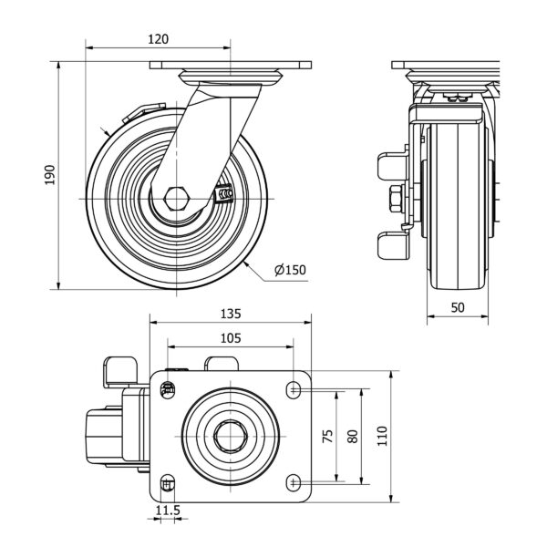 Rueda goma giratoria con freno Alex diametro 150 mm. modelo 4-1615