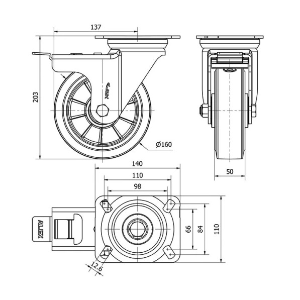 Rueda goma giratoria con freno Alex diametro 160 mm. 2-0398
