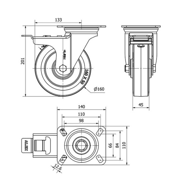 Rueda goma giratoria con freno Alex diametro 160 mm. modelo 2-2739