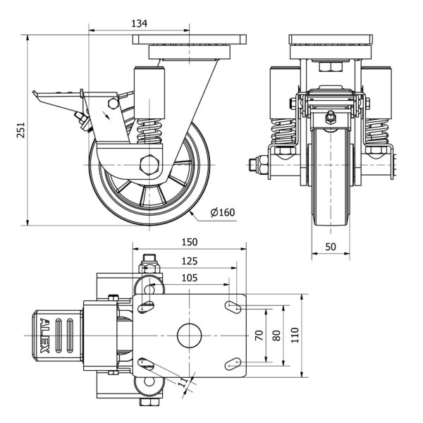 Rueda goma giratoria con freno Alex diametro 160 mm. modelo 2-4408