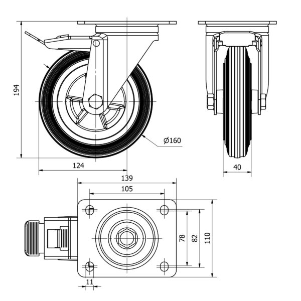Rueda goma giratoria con freno Alex diametro 160 mm. modelo TW0266