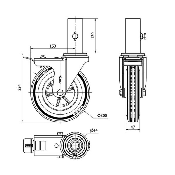 Rueda goma giratoria con freno Alex diametro 200 mm. modelo 2-0906