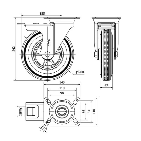 Rueda goma giratoria con freno Alex diametro 200 mm. modelo 2-1075