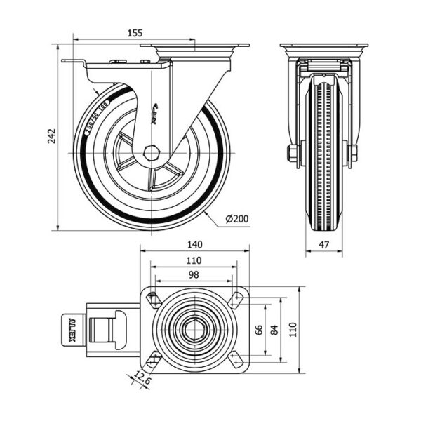 Rueda goma giratoria con freno Alex diametro 200 mm. modelo 2-1685