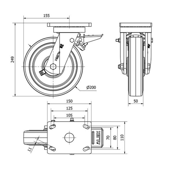 Rueda goma giratoria con freno Alex diametro 200 mm. modelo 2-1960