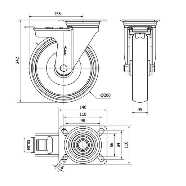 Rueda goma giratoria con freno Alex diametro 200 mm. modelo 2-3289