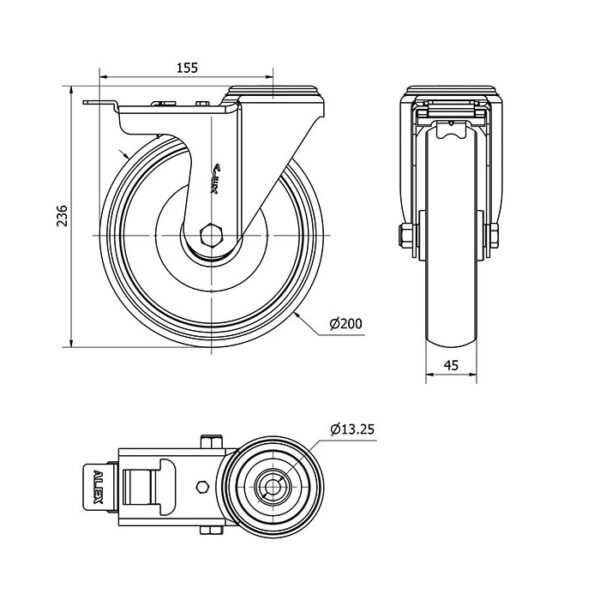 Rueda goma giratoria con freno Alex diametro 200 mm. modelo 2-3309
