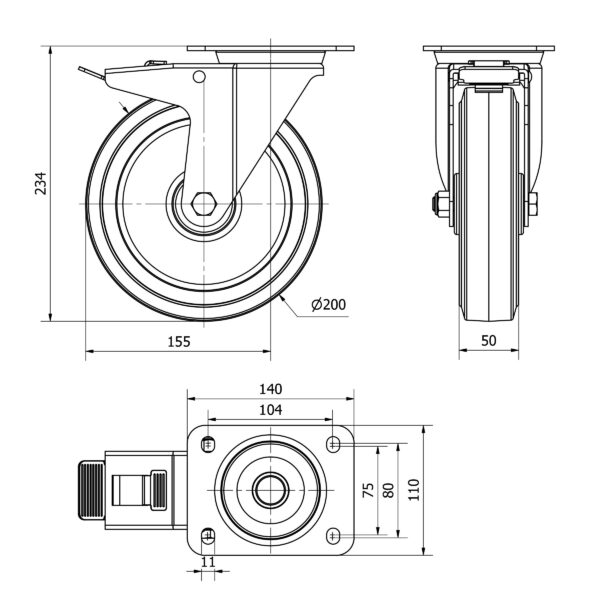 Rueda goma giratoria con freno Alex diametro 200 mm. modelo TW0301 EAN 8422202003016