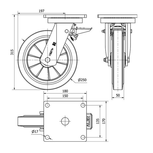 Rueda goma giratoria con freno Alex diametro 250 mm. modelo 2-1526