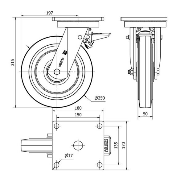 Rueda goma giratoria con freno Alex diametro 250 mm. modelo 2-1961