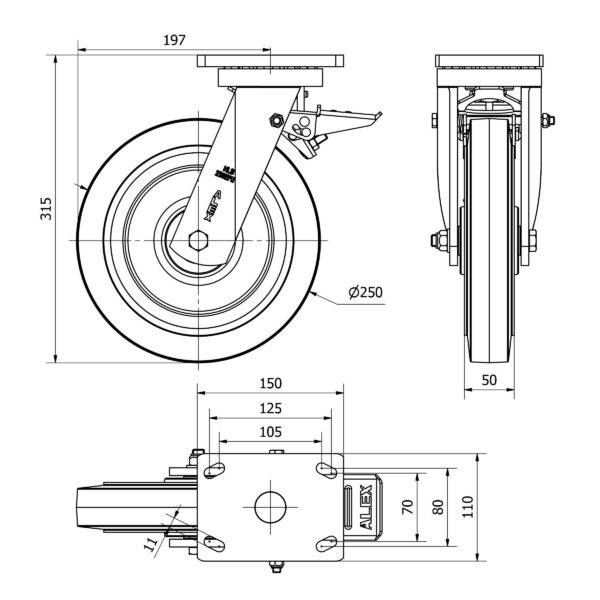 Rueda goma giratoria con freno Alex diametro 250 mm. modelo 2-2293