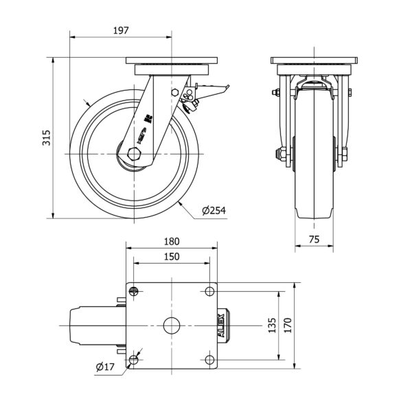 Rueda goma giratoria con freno Alex diametro 250 mm. modelo 2-3567