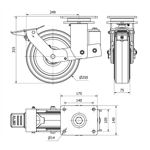 Rueda goma giratoria con freno Alex diametro 250 mm. modelo 2-3938