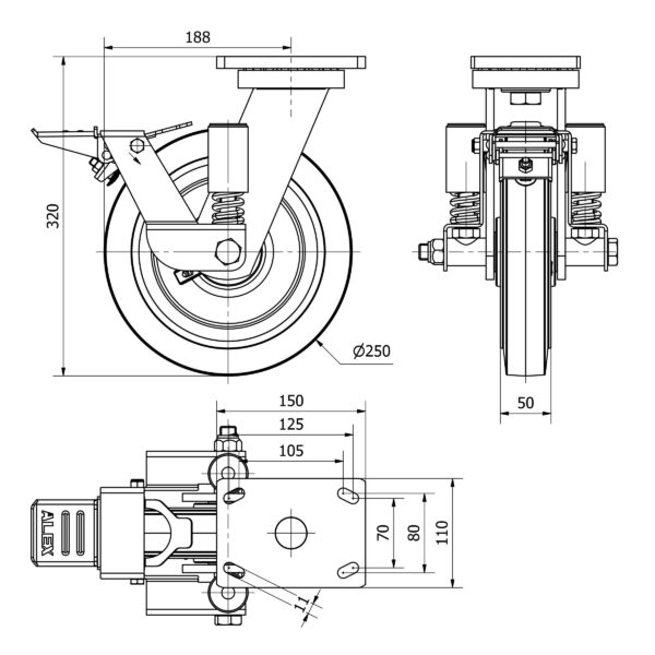 Rueda goma giratoria con freno Alex diametro 250 mm. modelo 2-4052