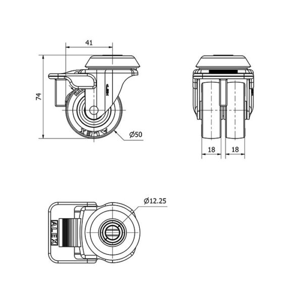 Rueda goma giratoria con freno Alex diametro 50 mm. modelo 1-0570