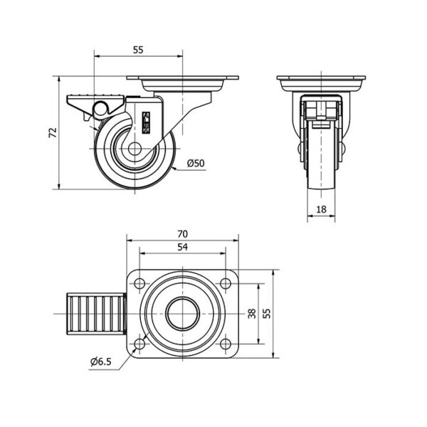 Rueda goma giratoria con freno Alex diametro 50 mm. modelo 1-0709
