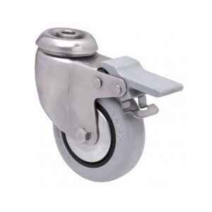 La serie de ruedas Alex BHI INOX-PGI son de goma gris inyectada, con todos sus componentes de acero inoxidable (AISI-304), indicadas para soportar cargas hasta 60 Kg. Se utilizan en exteriores, carros de transporte de alimentación, cantinas, comedores, restaurantes, empresas de alimentación, máquinas de embalajes y cintas transportadoras. PGI: No ralla el suelo. Silenciosa y no deja huella.