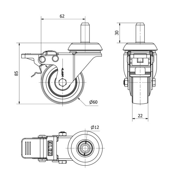 Rueda goma giratoria con freno Alex diametro 60 mm. modelo 2-4636