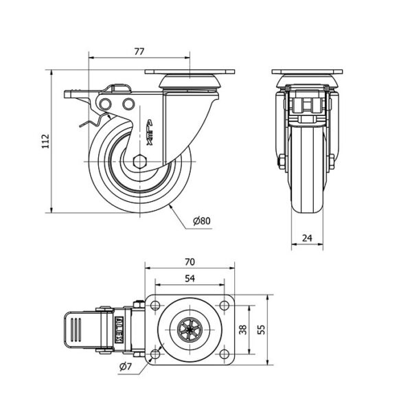 Rueda goma giratoria con freno Alex diametro 80 mm. modelo 1-0386