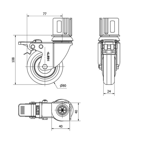 Rueda goma giratoria con freno Alex diametro 80 mm. modelo 1-0388