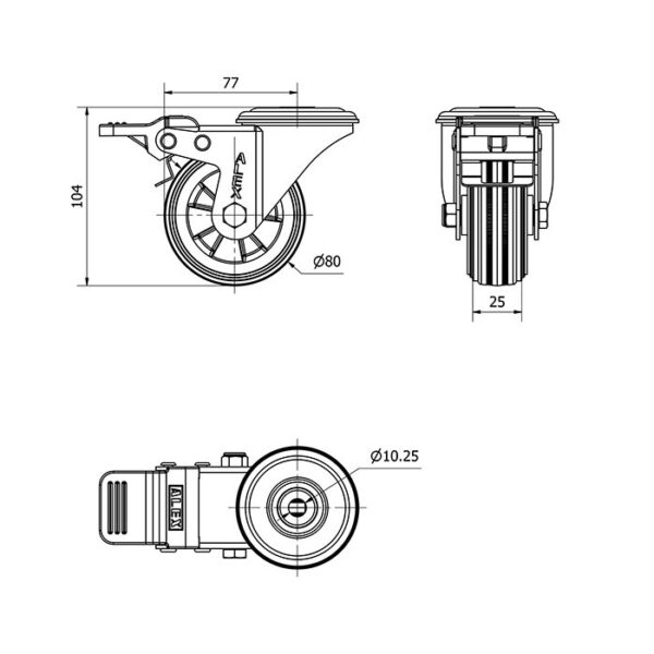 Rueda goma giratoria con freno Alex diametro 80 mm. modelo 2-2307