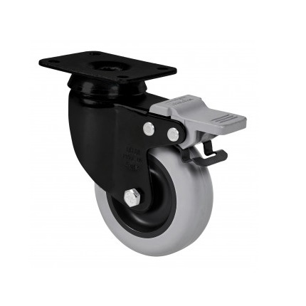 La serie de ruedas Alex BH-PGI NEGRA son de goma gris inyectada, indicadas para soportar cargas hasta de 60 kg. Fabricada con chapa pintada negra hasta 2 mm. de espesor. Se utilizan en supermercados, expositores, muebles, cajas apilables, taburetes, vitrinas, percheros, carros de hostelería, útiles para hospitales, mobiliario clínico sanitario y goteros, ya que no rallan ni dejan huella en el suelo y son muy silenciosas.