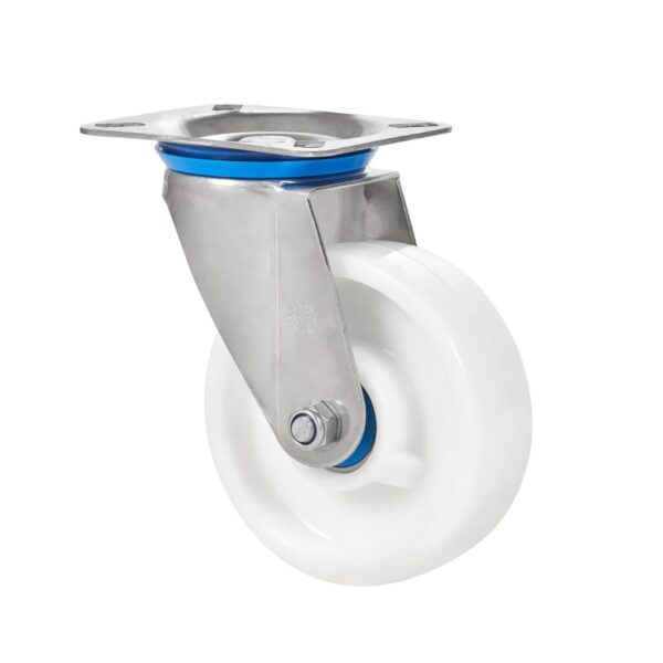 Ruedas de nylon blanco con todos sus componentes en acero inoxidable (AISI-304), especialmente indicadas para soportar cargas de hasta 600 Kg.