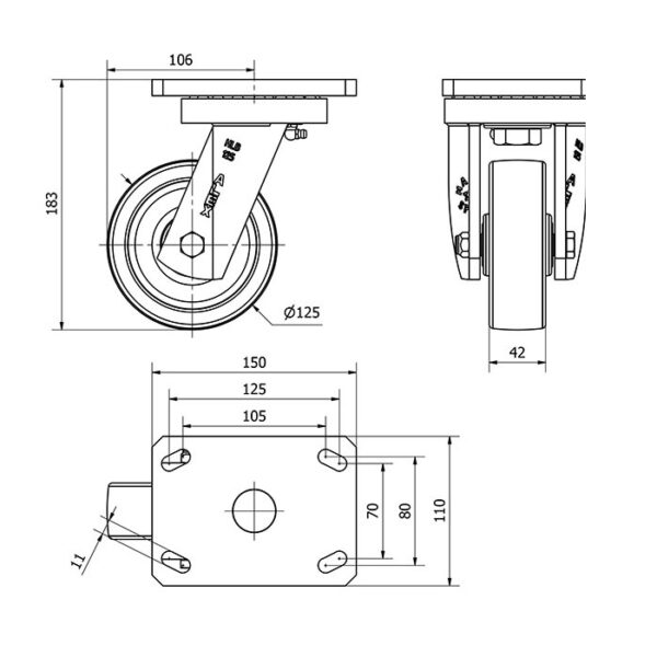 Rueda nylon-poliamida giratoria Alex diametro 125 mm. modelo 2-0465 EAN 8422202204659