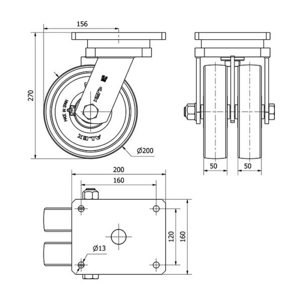 Las ruedas Alex serie HLG-FT son ruedas dobles de nylon extrafuerte, indicadas para soportar altas cargas hasta 2.500 Kg. Se utilizan en útiles de transporte logístico, grúas que transportan materiales pesados, así como plataformas elevadoras y gradas móviles, principalmente en el sector aeronáutico, ferroviario y automoción. FT: Ruedas especialmente indicadas para aplicaciones en industrias alimentarias y químicas. No manchan el suelo. Extrafuertes. Alta resistencia a golpes y choques.