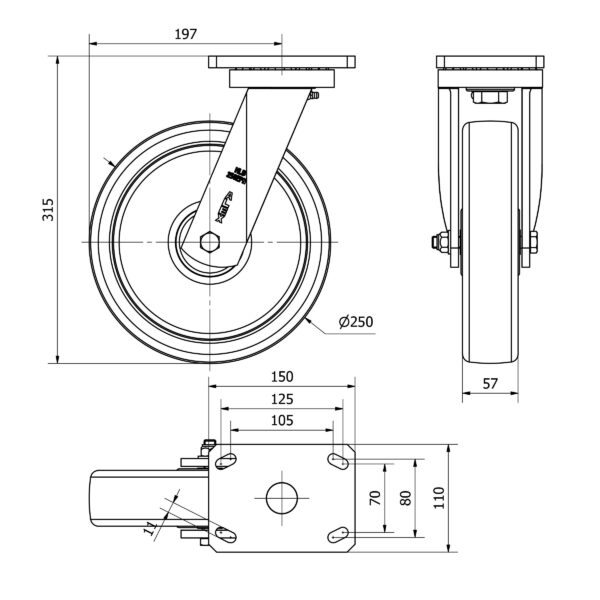 Rueda nylon-poliamida giratoria Alex diametro 250 mm. modelo 2-2297